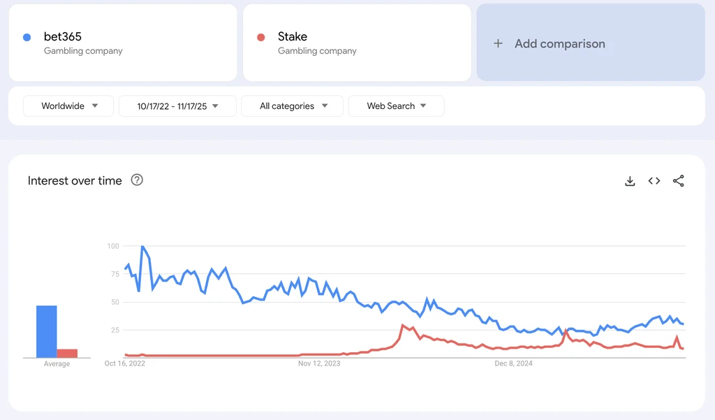 Below is a Google Trends chart which shows a stark reality of the bleed from Bet365 to Stake over the past three years.