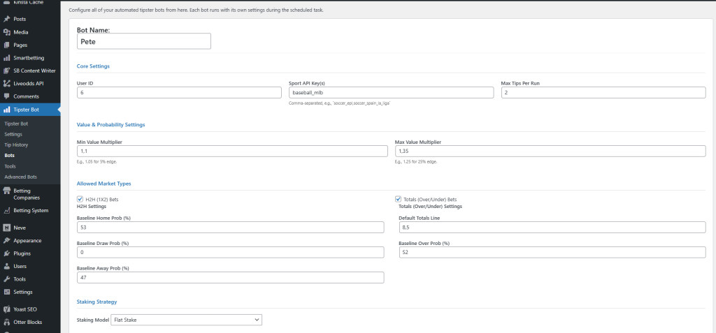 The system monitors markets every 15 minutes and continues to track odds movement for active tips, recommending readers the best currently available market odds at the time of reading. It also stores the closing odds for events, which can be used in content to evaluate the “quality” of selections.