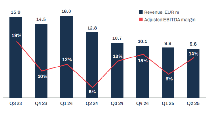 Rest of the World (ROW) revenue fell from €1.6m to €929,000 and adjusted EBITDA slumped to just €479,000.