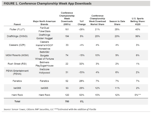 The app downloads were from operators Flutter, DraftKings, Caesars, MGM Resorts, Rush Street, PENN Entertainment, Fanatics, bet365 and Hard Rock.