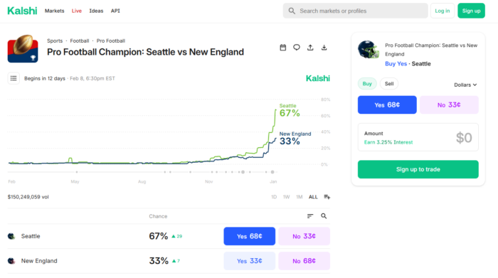 Prediction markets platform Kalshi has surpassed $150m in trading for the Super Bowl, while the same market on Polymarket is nearing $700m in trading.