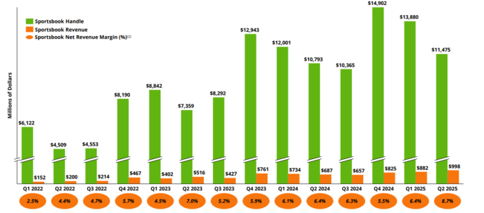 Structural sportsbook hold percentage hit 10.9%, while parlay handle mix jumped 430 basis points compared to Q2 2024. Actual sportsbook hold was above 11.5% due to positive results for the firm.