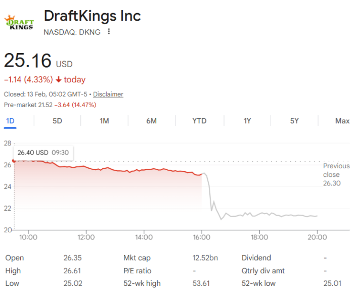 DraftKings tumbled 15% in after-hours trading in New York after closing yesterday, 12 February, at $25.16, which was a fall of more than 4% on the day before the bell rang in New York. The stock is down 27% this year.
