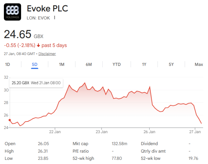 The statement triggered a sell-off of evoke shares in London, with the stock down more than 10% to under 25p immediately after the market opened.