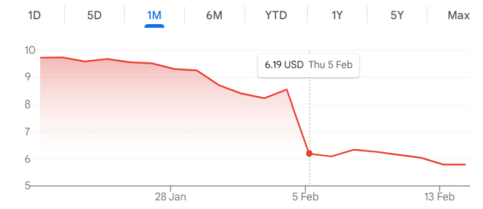 The stock has continued to decline, hitting $5.79 before the market opened today. The share price closed at $8.54 the day before the deal was announced, yet the firm’s market cap has almost halved since the turn of the year to $1.4bn.