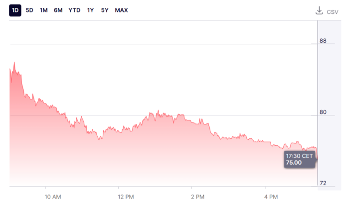 Despite trading at a high of SEK86.50 following a strong spike after the market opened, the price began to fall and sat at SEK75 as the day closed, a dip of 2.6% below the initial set price.