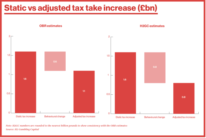 Based on estimates from the OBR, the government would, all being equal, collect an additional £1.6bn from operators in 2027-28, when both remote gaming and sports betting tax hikes have kicked in. However, this figure shrinks to a net yield of £1.1bn when accounting for behavioural responses.