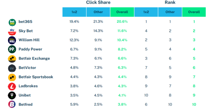 Bet365 snared 19.4% of all clicks on 1×2 markets, with the dominance expanding to 21.3% on all other markets.