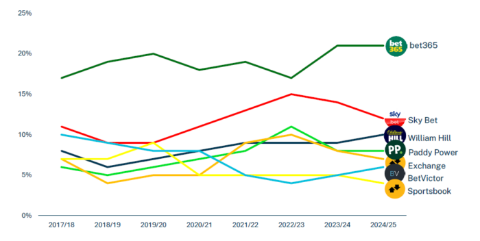 Oddschecker said: “Bet365 maintained its dominance in clickshare for the 2024-25 season, holding a consistent 21% share for the second year running.