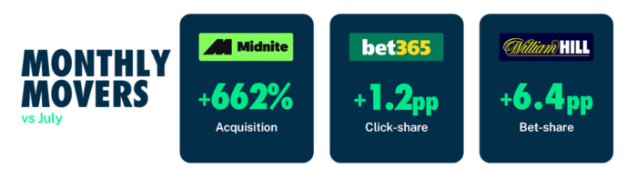 Elsewhere, bet365 increased its clickshare across oddschecker in August by 1.2 percentage points versus July.