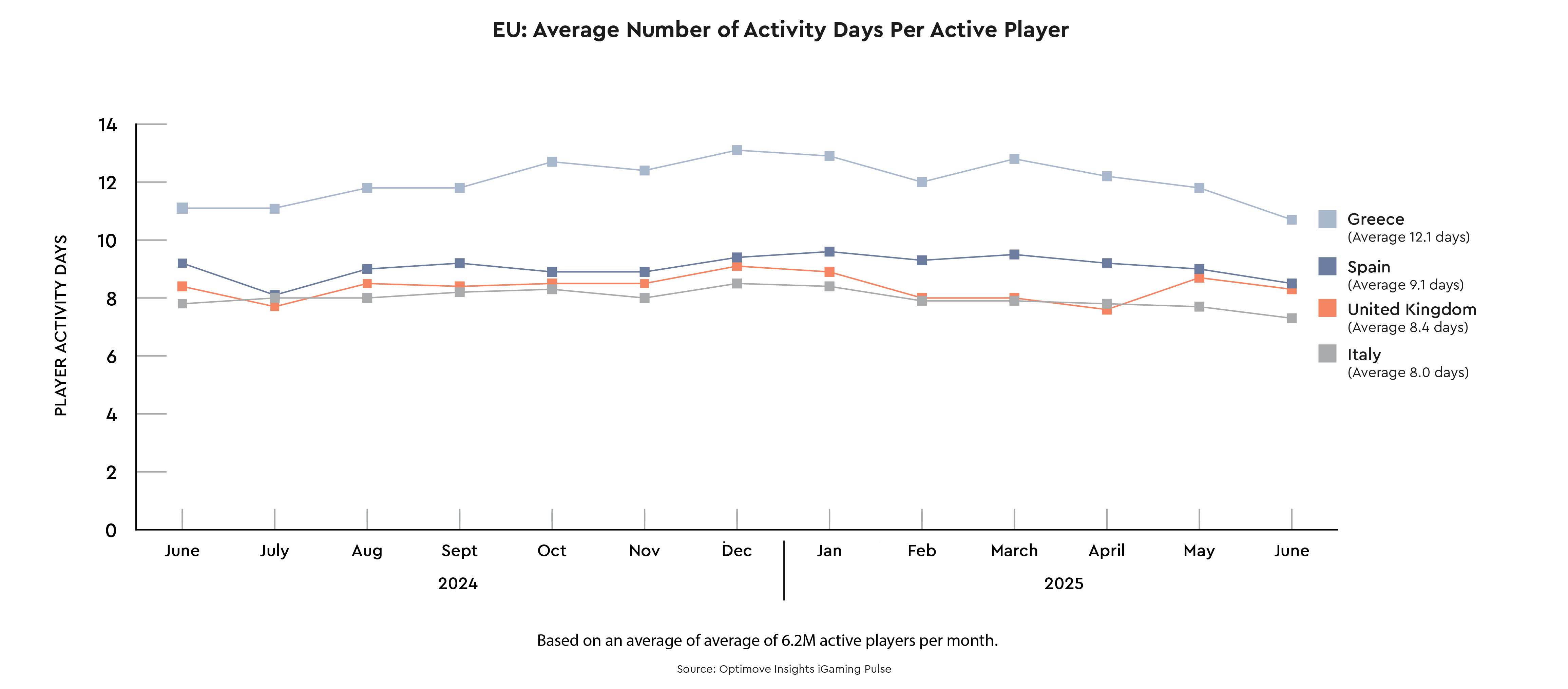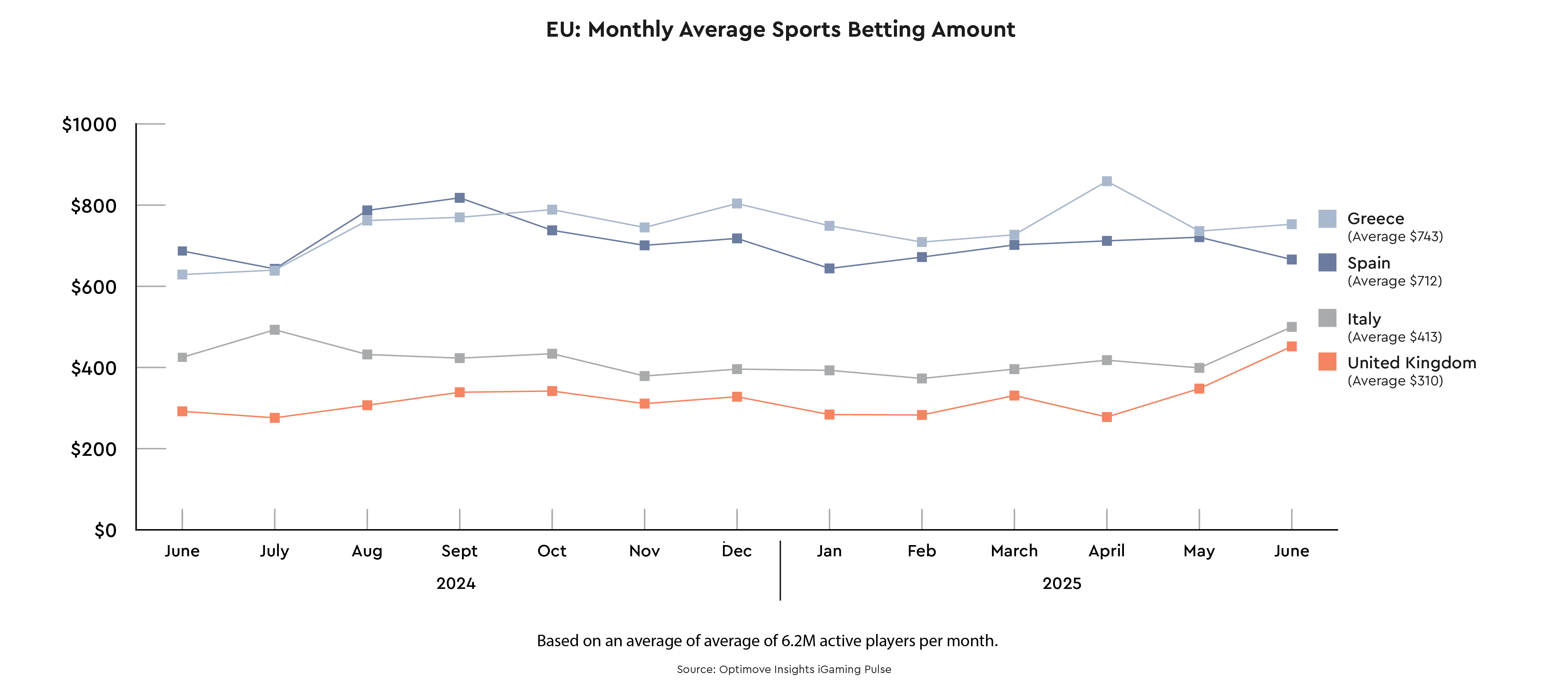 The Optimove Europe Gaming Pulse Report – June 2025 – analyses betting behaviour across Greece, Italy, Spain, and the UK, based on a 12-month average of over 6.2 million active players per month.