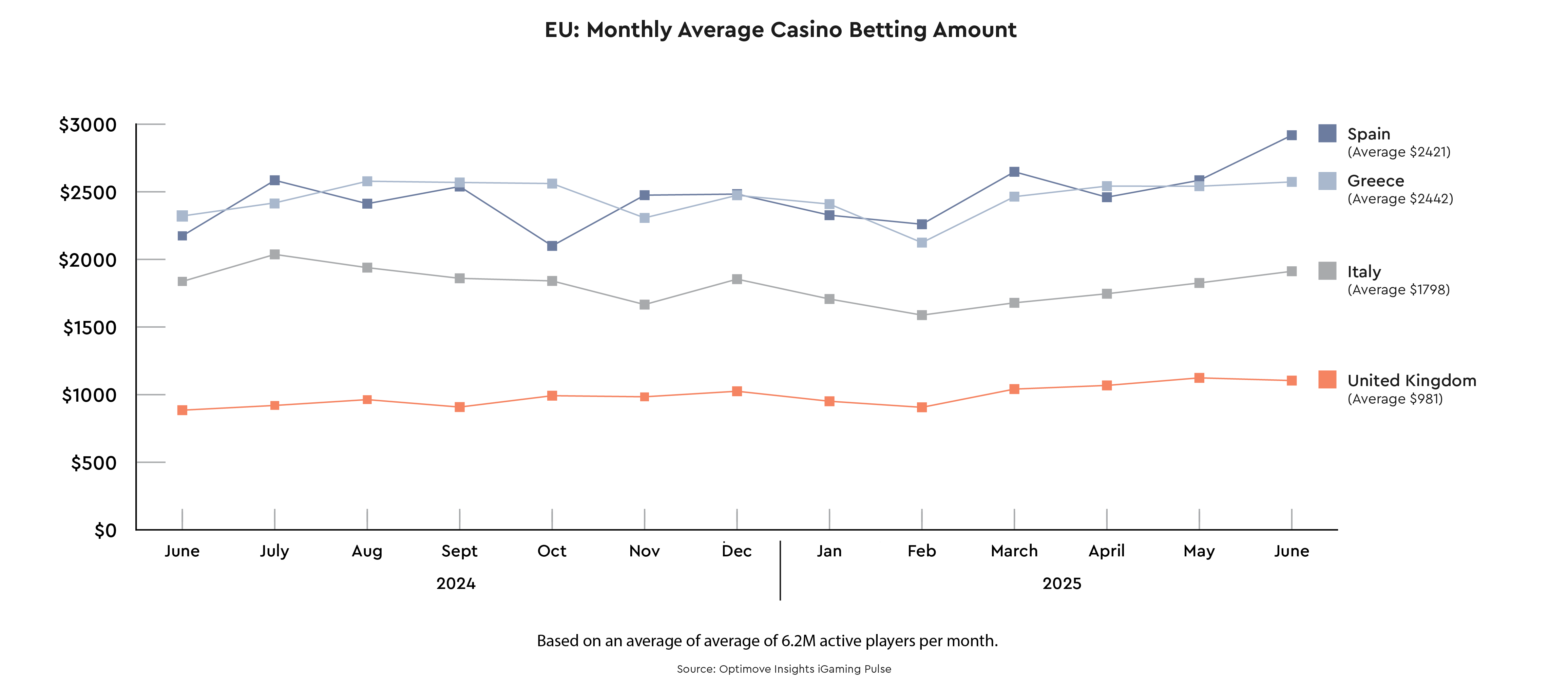 In recent months, Spain and Greece closely followed each other in total casino bet amounts. However, in June 2025, Spain surged to the highest level recorded across all countries during the observed period. Italy maintained a stable trend, with a notable year-over-year increase in June. Meanwhile, the UK consistently recorded the lowest average casino bet amounts, though it has shown gradual growth in recent months.