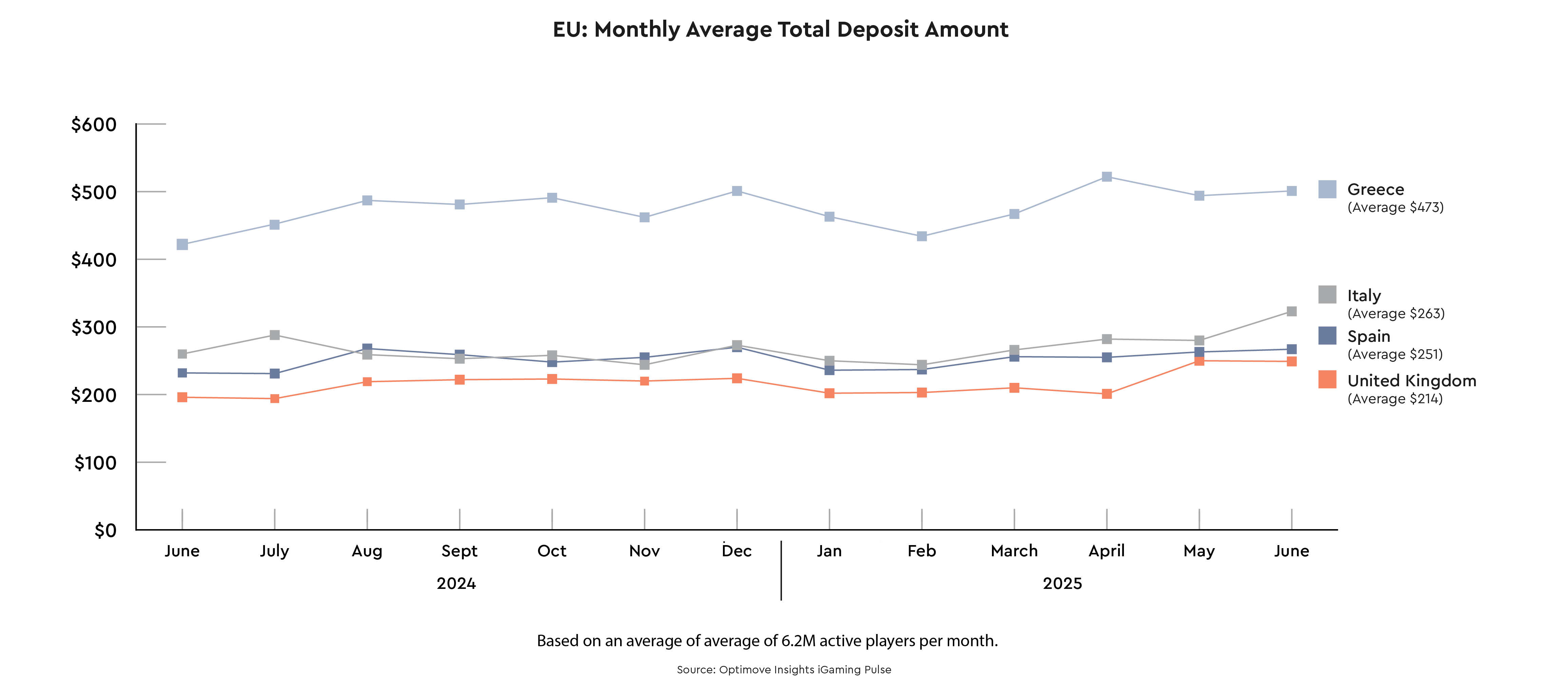 Italy and Spain remain in the mid-range, with a notable increase in Italy in June 2025. The UK continues to have the lowest average deposit amounts, however, with an increase in the past two months getting closer to Spain deposits level.