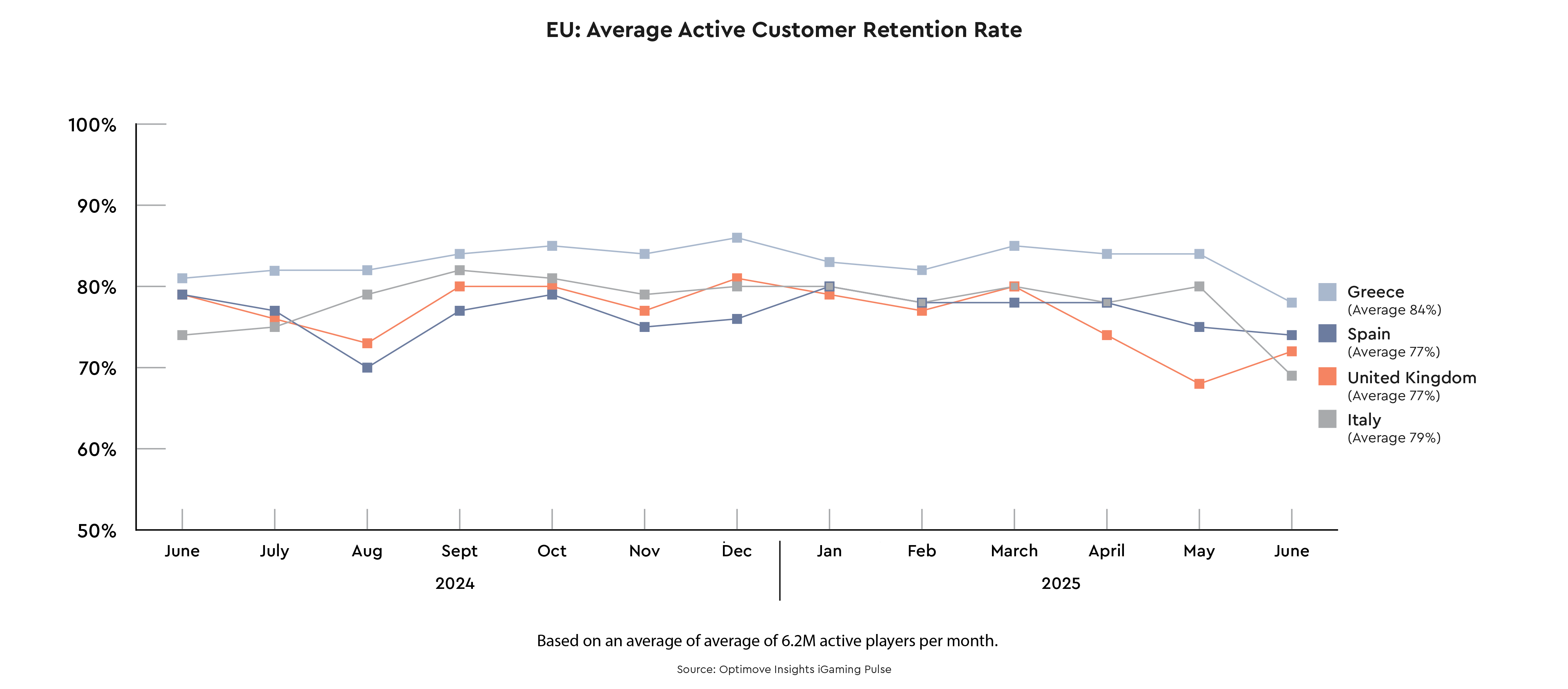 Greece consistently led in average active retention rate throughout the period, though it experienced a dip in June 2025. The other countries displayed high volatility in retention over the year. The UK reached its lowest retention level in May 2025, with signs of recovery in June, though still below its typical range. Italy saw a notable decline in June, falling to its lowest retention level in the observed period.