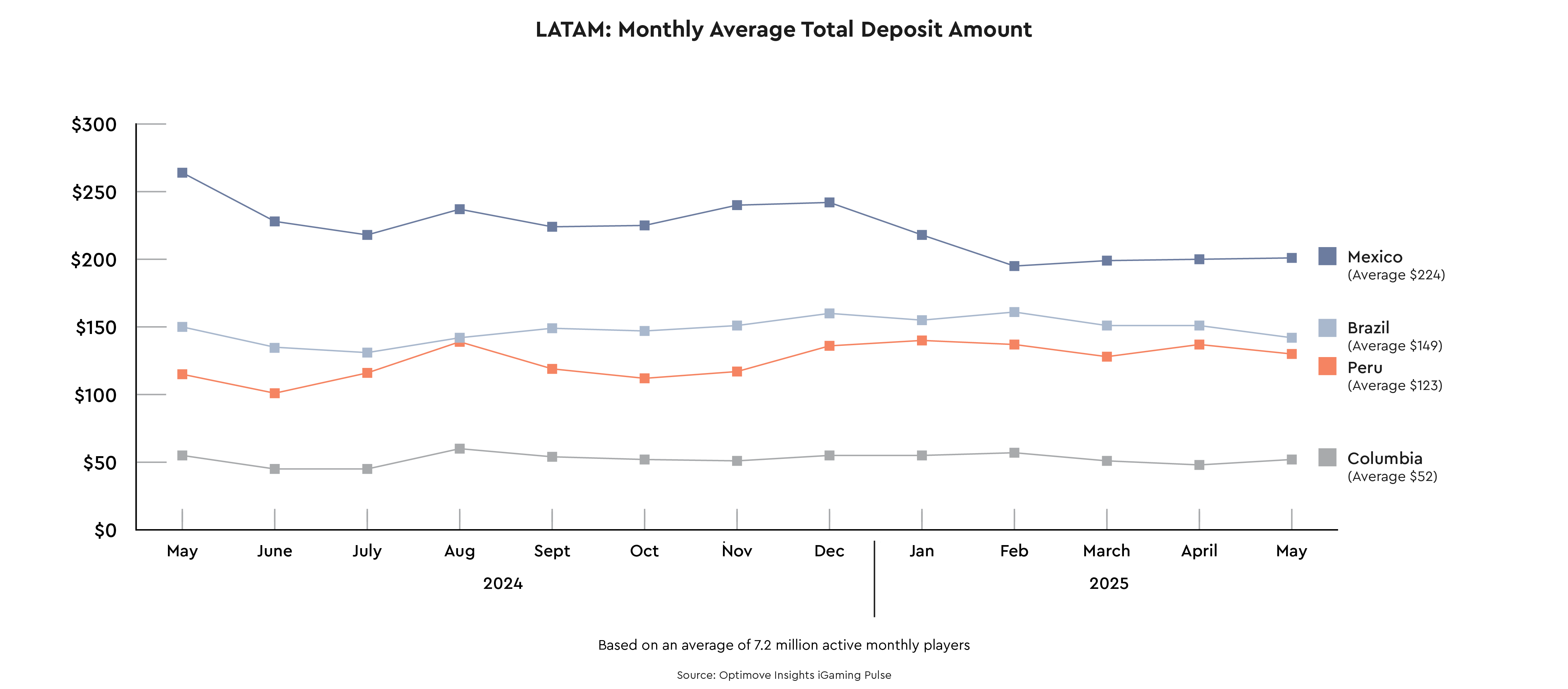 • Mexico leads in both average deposit amounts and sports betting volume. In May, the average deposit dropped to $201 (£148) while sports betting reached $603.