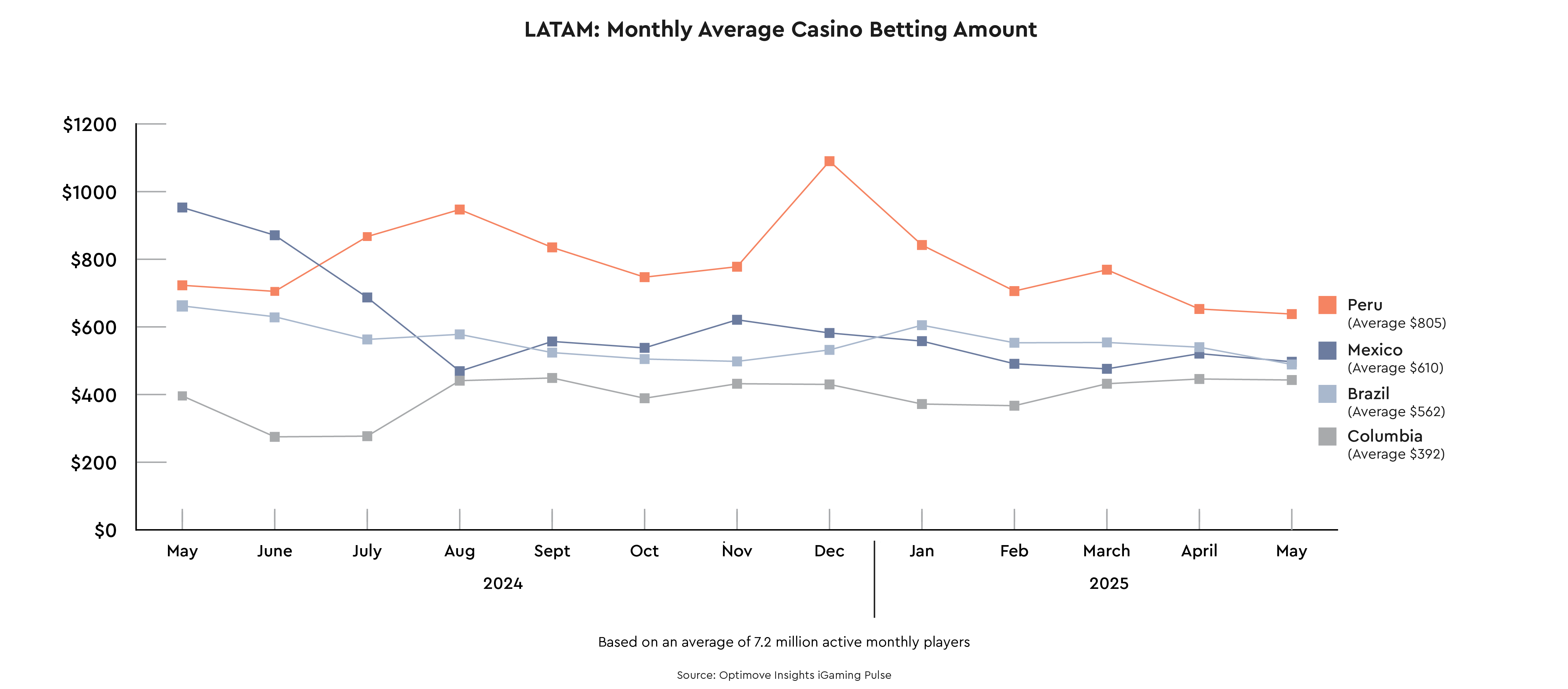 Peru consistently leads in average monthly total casino bet amounts, maintaining the highest values among the four Latam countries tracked in this report.