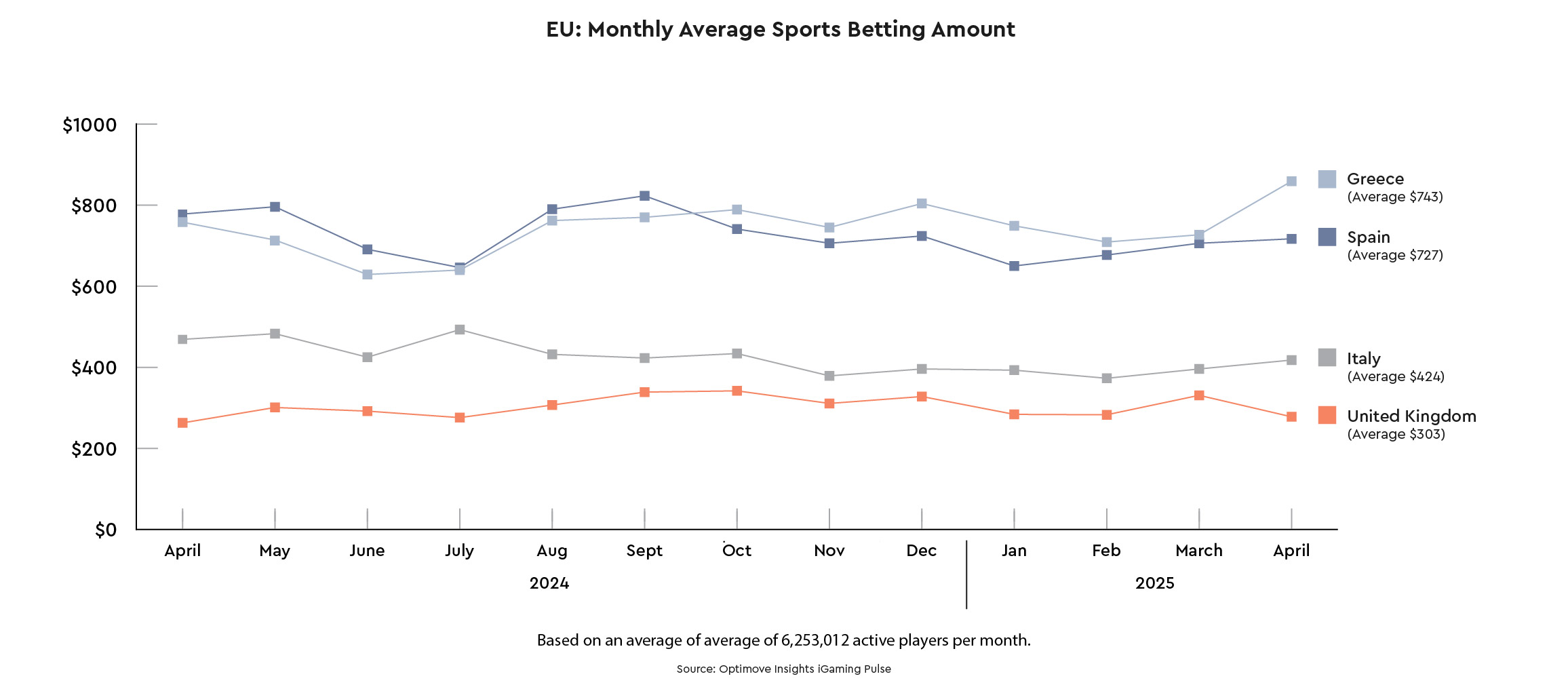 Spain reported the highest total casino betting amount in April ($2,811), supported by consistent growth and high engagement (9.3 average activity days). Sports betting volume remained strong at $717 in April, close behind Greece.