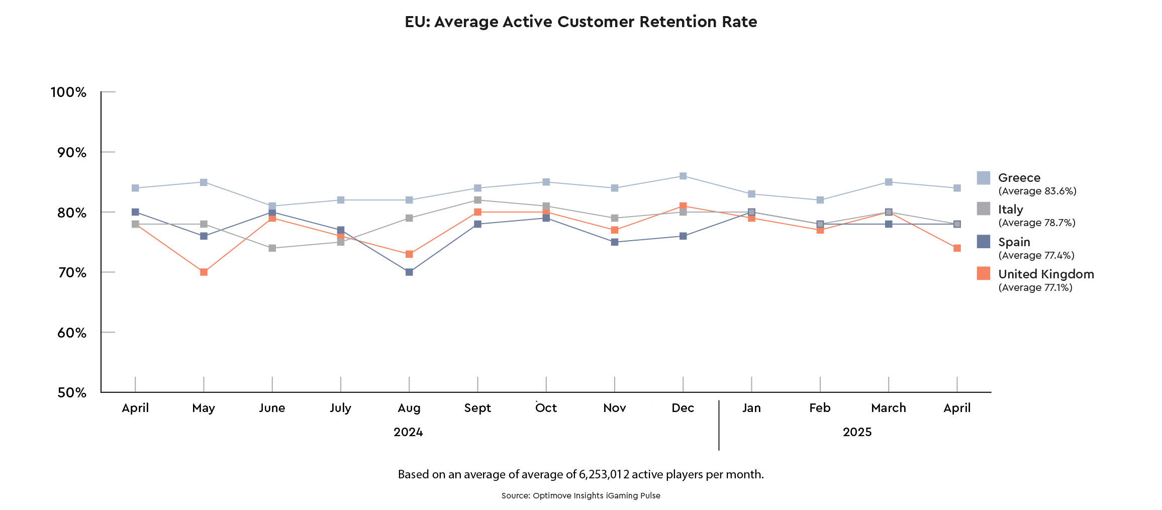 Greece consistently led in average active retention rate, reaching 84% in April 2025. The other countries showed a strong volatility trend over the year ranging 70–80.