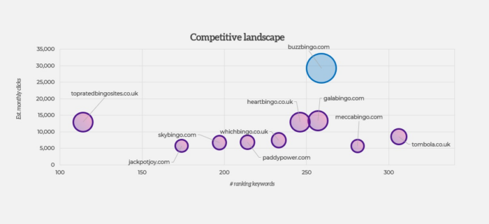 Buzz Bingo has maintained its place at the top of the table by focusing on core, high-value keywords, ranking first for ‘bingo’. While the number of ranked keywords has fallen in the last six months from 320 to 259, the company has experienced a 19% increase in clicks overall, which suggests this concentrated strategy is working.