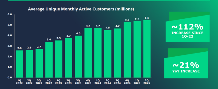 Monthly active customers jumped 21% YoY to 5.5 million for the Betway and Spin parent company.