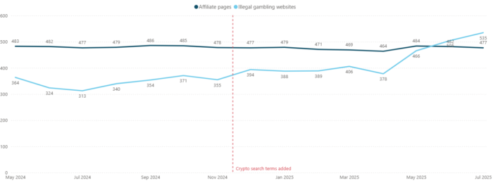 This left researchers with illegal operator sites and affiliates promoting unlicensed entities. Crypto casino search terms were added in December 2024 to expand the reach.